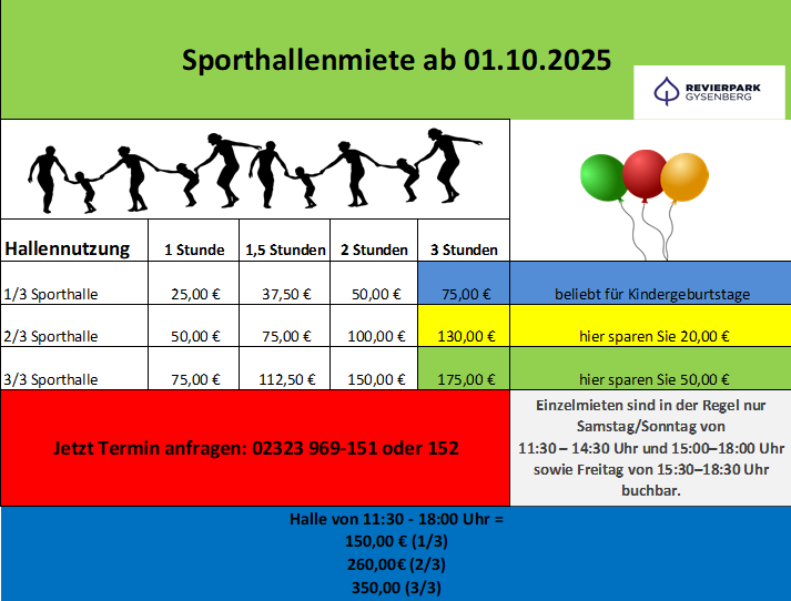 - Die Sporthallennutzer dürfen bereits 15 Minuten vor Beginn der Veranstaltung in die Sporthalle, müssen die Halle aber pünktlich verlassen.